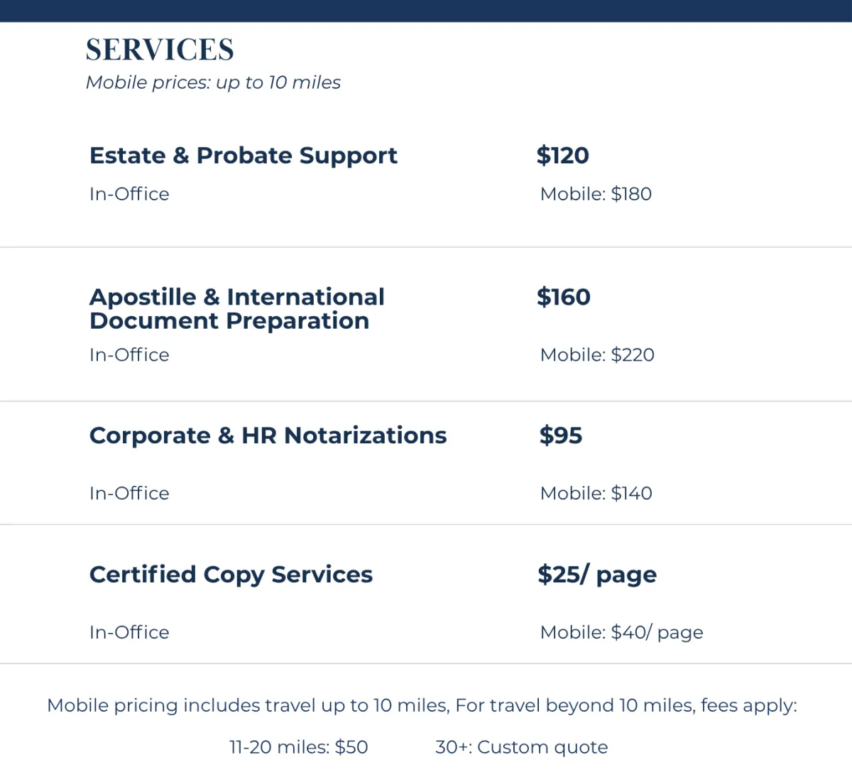 Fees: Notarial fees are set in accordance with Massachusetts law..ditional service and travel fees are always disclosed prior to appointment.